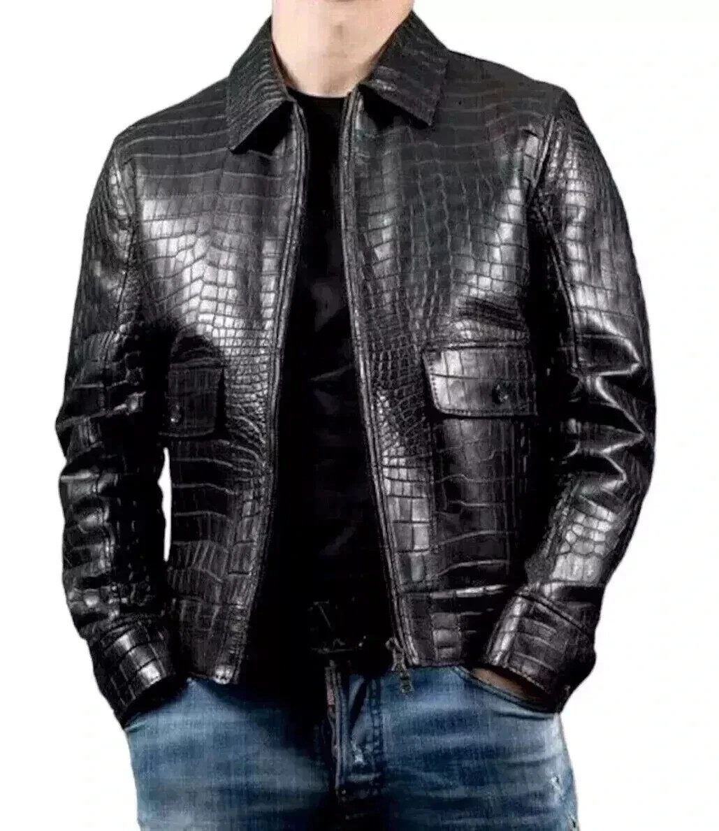 NEW Men’s Dark Green Python Embossed Leather Jacket NWT