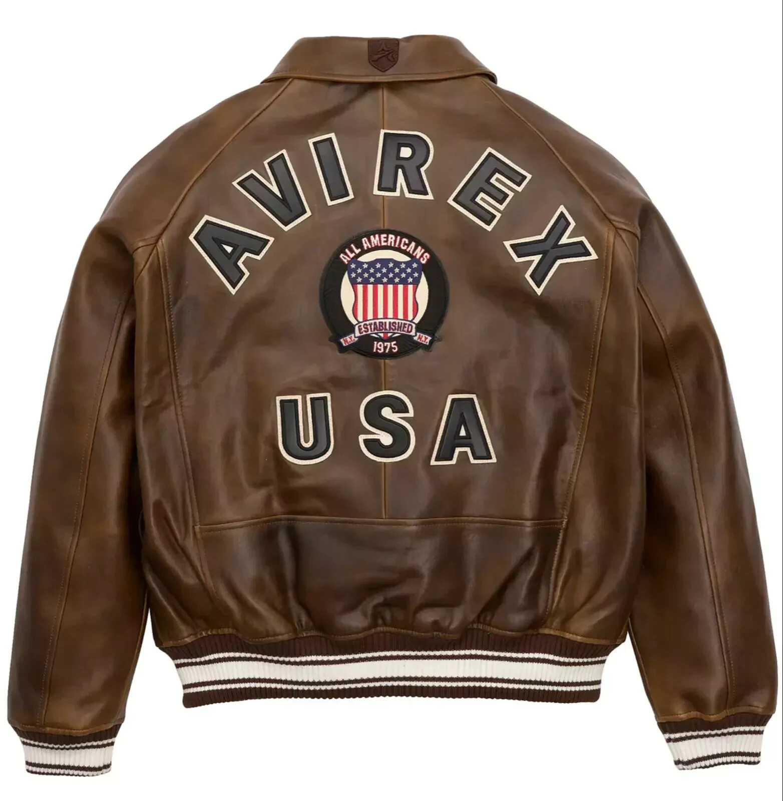 • Men’s Avirex USA American Bomber Flight Genuine Cowhide Brown Leather Jacket