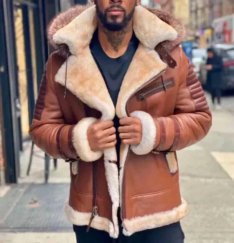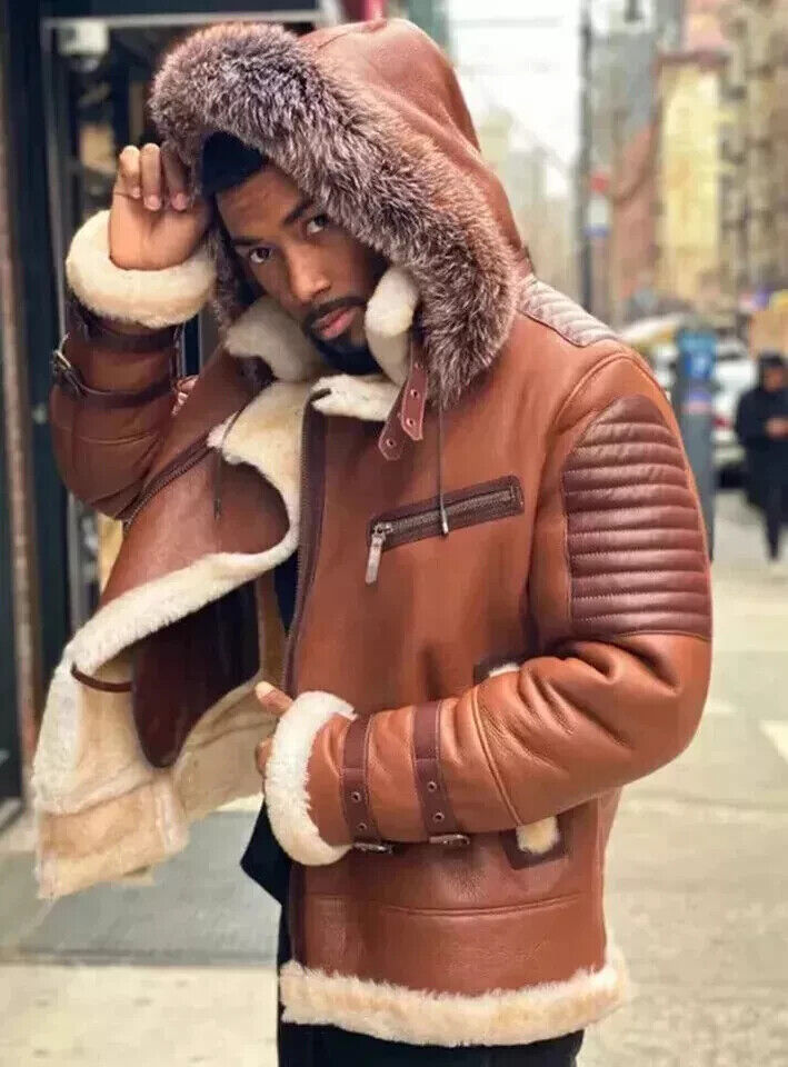 NEW Men Aviator Bomber B3 Sheep Skin Fur Collar Hooded Real Leather Jacket Coat