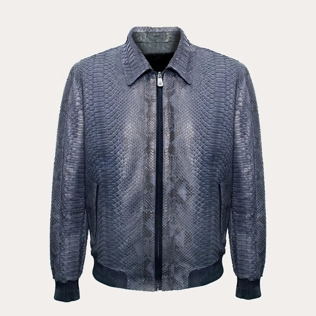 NEW Men’s Embossed Luxury Blue Python Snakeskin Bomber Zip Up Leather Jacket