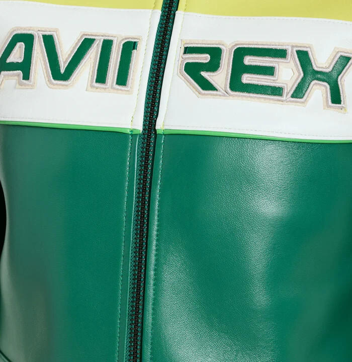 Moto jacket in 100% leather cropped for a more feminine fit. Features Avirex colorblock logo at front.